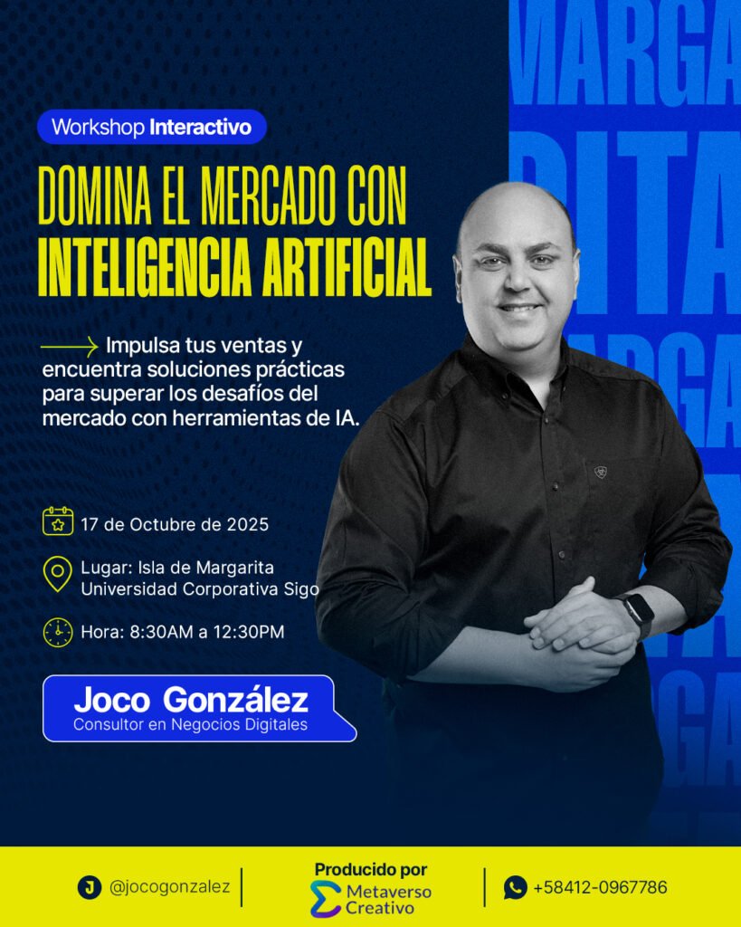Por eso creamos el Workshop Interactivo: “Domina el Mercado con Inteligencia Artificial” 🧠, diseñado para empresarios, emprendedores y líderes que quieren vender más, automatizar procesos y potenciar resultados.